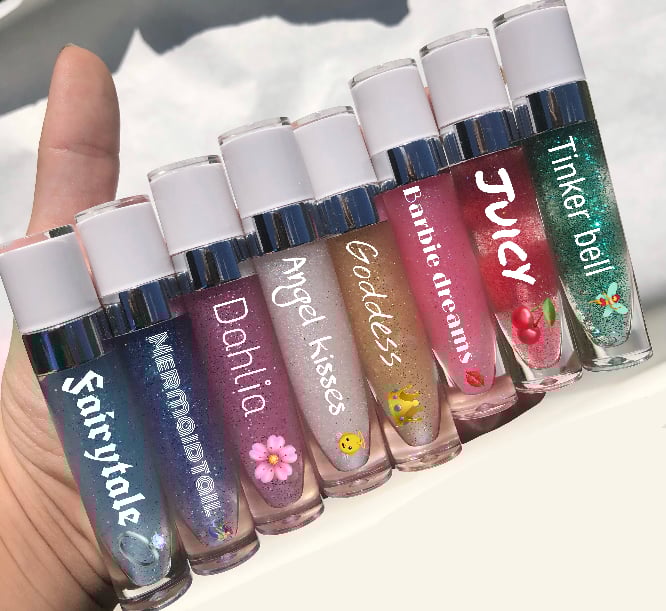 Juicy- raspberry scent Barbie dreams- watermelon scent Dahlia- no scent Goddess- pineapple scent Tinker bell- peppermint scent and lip plumper Fairytale- no scent Mermaidtail- piña colada scent Angel kisses- coconut scent